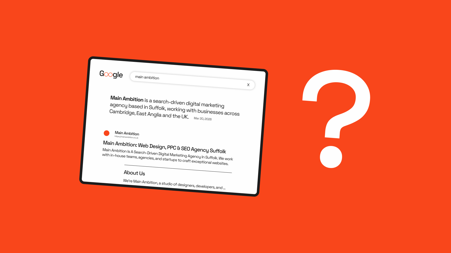 At Main Ambition, we specialize in search-driven digital marketing for businesses across Suffolk, Cambridge, and the broader UK. Our integrated approach combines traditional SEO with Answer Engine Optimisation (AEO), ensuring your business captures visibility across every platform where potential customers search.